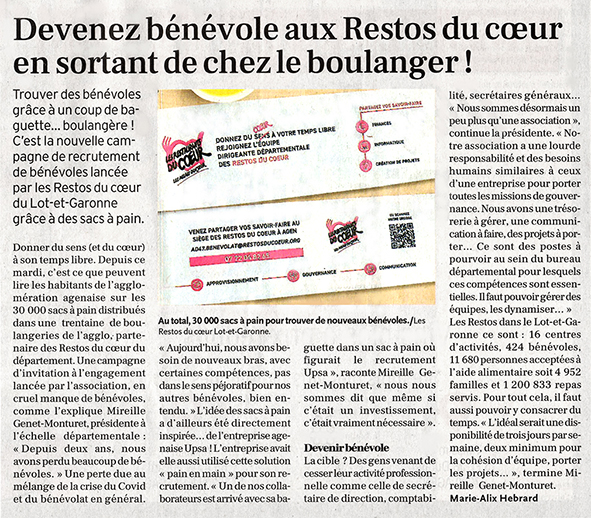 Le 26 avril et le 12 mai 2022, Guyenne Presse et Pub&Pain apparaissent de nouveau dans le journal, cette fois-ci avec la campagne de recrutement des Restos du Coeur.